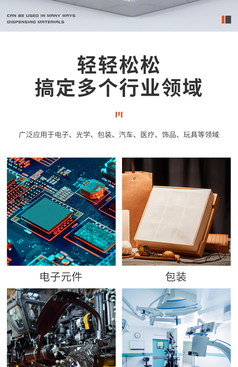 不管您是從事水性液體或濃稠膏狀流體的點膠作業(yè),本控制器都可以大幅度降低您的作業(yè)成本,提高您的產品品質、效率以及減少您的流體用量,廣泛應用于電子、光學、包裝、汽車、醫(yī)療、飾品、玩具等領域。